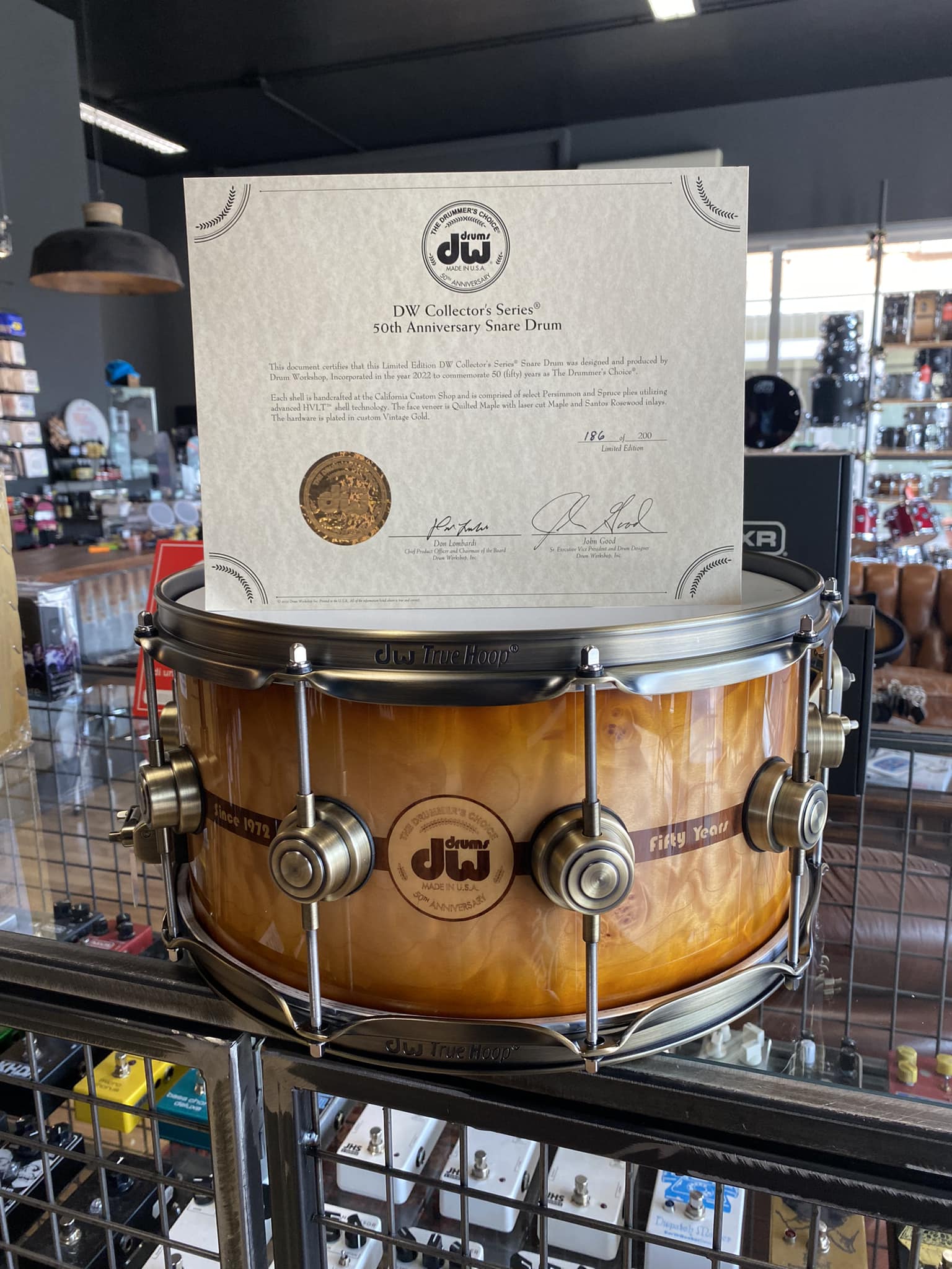 2.899,00 €Fusto HVLT ibrido kaki/abete rosso a 12 stratiHardware dorato antico, tendicordiera MAG, True-Hoops e molto altro.Include un distintivo del 50° anniversario con intarsi in acero e palissandro e una fascia che abbraccia il fusto e impiallacciatura in acero trapuntato.200 al mondo di questi 50° anniversario 6,5 x 14″ e ciascuno includerà una custodia DW 50° anniversario e un certificato di autenticità firmato -